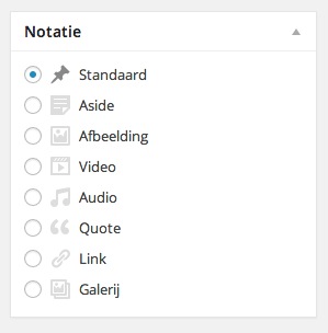 In dit standaard theme ‘2014’ maakt WordPress gebruik van de zogenaamde ‘notatie’. Eigenlijk is dat niet meer dan een technische aanduiding van het type artikel. In verreweg de meeste gevallen staat dat op ‘standaard’.